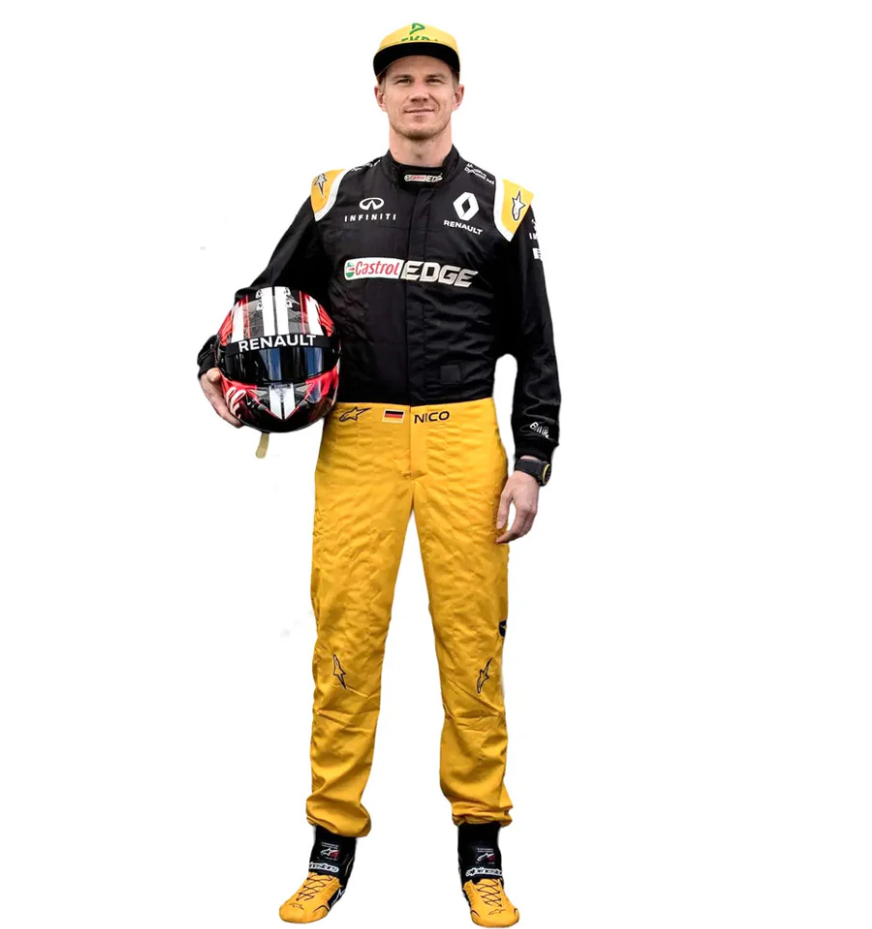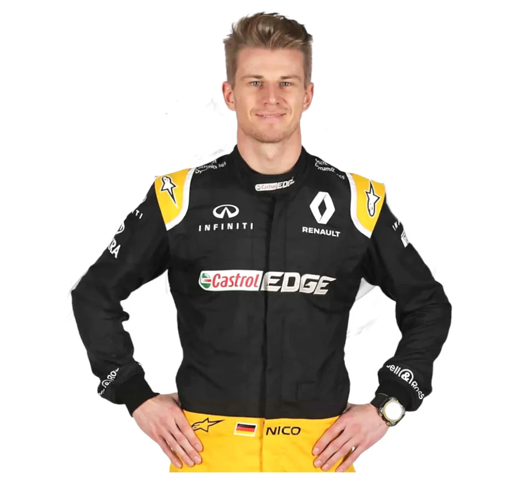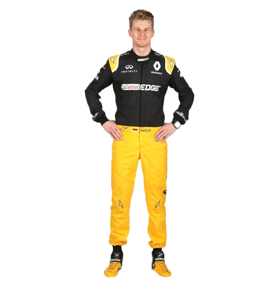 - Authentic 2017 Design: Faithfully replicates the official race suit worn by Nico Hülkenberg during the 2017 season, featuring Renault F1 Team branding and sponsor logos.