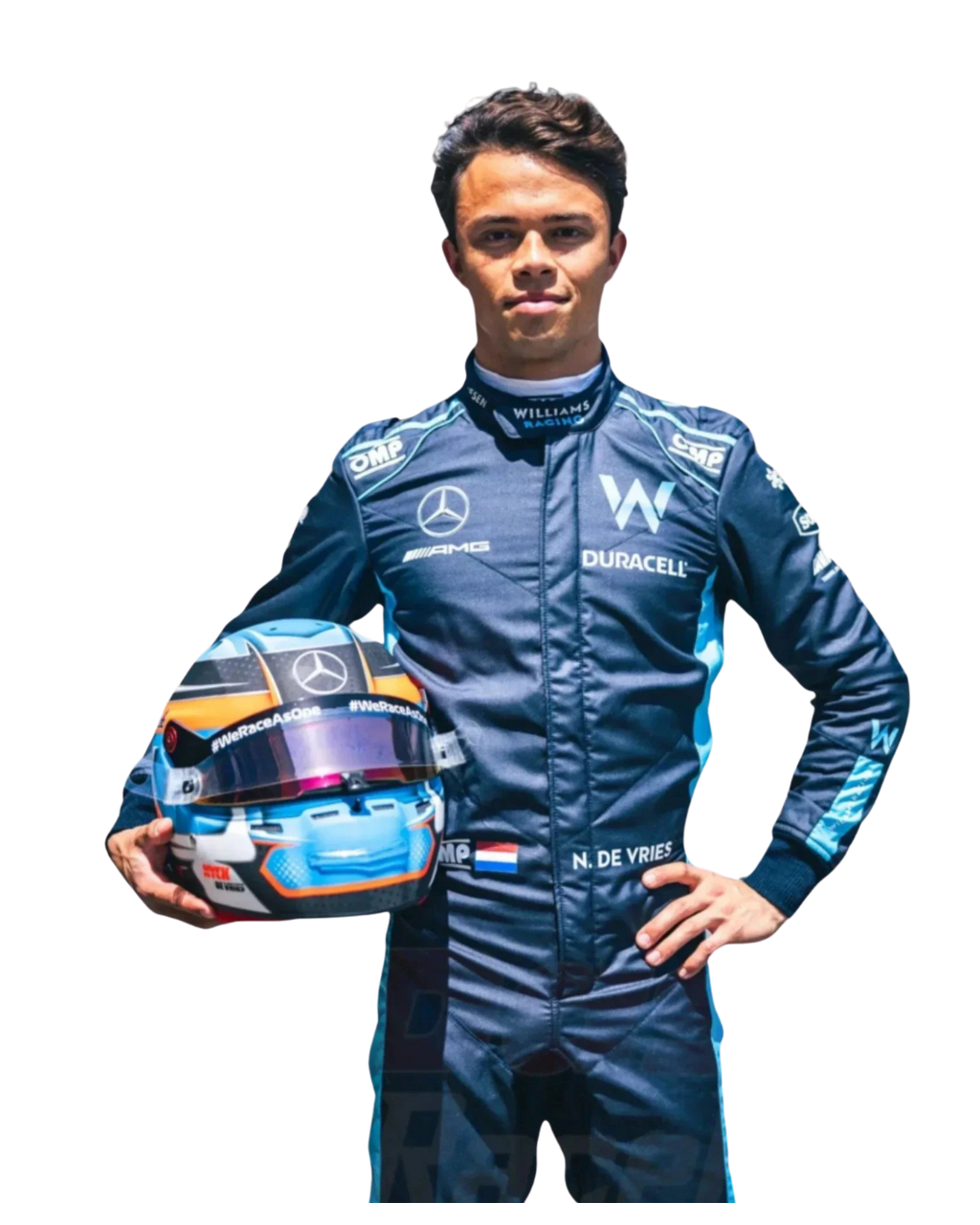 - Authentic 2022 Design: A true-to-life reproduction of the 2022 race suit worn by Nyck de Vries, featuring Williams Racing team branding, sponsor logos, and the distinctive design elements that defined his first official race appearance.